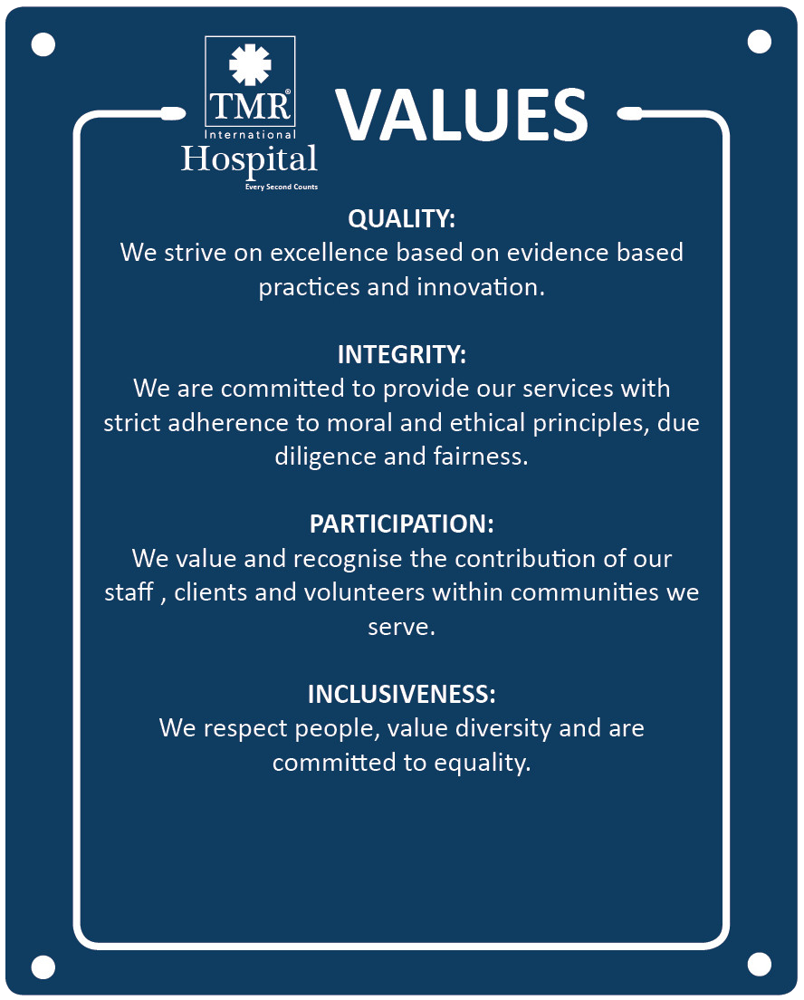 TMR International Hospital appreciates that the patients’ family play a vital role in ensuring the health and wellbeing of the patients. Consequently, patients and their families are at the core of everything we do. The Hospital healthcare approach is one that engages both the patient and his/her family, in providing care and services that are responsive to their needs at the same time exceeding their expectations.